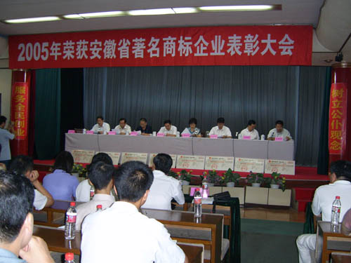 2006年7月26日下午,馬鞍山市2005年獲省著名商標(biāo)企業(yè)表彰大會(huì)在市政府東二樓會(huì)議室舉行,出席本 次會(huì)議的主要領(lǐng)導(dǎo)有省工商局副局長(zhǎng)黃家華、市人大常委會(huì)副主任杜永田、市政府副市長(zhǎng)劉榮華、市政協(xié) 副主席孫文植、市政府副秘書長(zhǎng)王興無、省工商局商標(biāo)局局長(zhǎng)劉國(guó)建等。