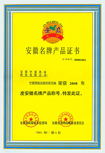 中德牌液壓板料折彎機喜獲2008年“安徽省名牌產品”的殊榮,這是繼2005年中德牌液壓擺式剪板機獲“安徽名牌產品”之后,中德機床的質量和信譽又一次獲得認可。與此同時,中德牌液壓擺式剪板機也順利通過安徽名牌產品的復審,證書的有效期將延長至2013年。