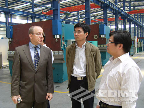 在整個(gè)的參觀過程里, EDWIN先生了解了我們先進(jìn)的工廠全程監(jiān)控系統(tǒng),寬敞明亮的工作車間以及外形簡潔優(yōu)雅的產(chǎn)品。相信在韓總流暢的英文翻譯下,EDWIN先生一行對(duì)本地區(qū)剪折行業(yè)的發(fā)展?jié)摿σ欢ㄓ辛诵碌恼J(rèn)識(shí)。同時(shí),我們很感謝韓總和EDWIN先生,他們站在一個(gè)全新的角度,對(duì)中德機(jī)床提出了建設(shè)性的建議。我們也希望中德機(jī)床精益求精,同ESTUN公司和DELEM產(chǎn)品建立更緊密的關(guān)系,將中德機(jī)床推向更廣闊的市場。