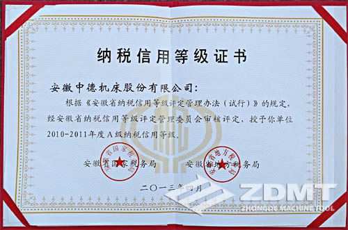 中德機(jī)床喜獲安徽省“A級(jí)納稅信用等級(jí)單位”稱號(hào)